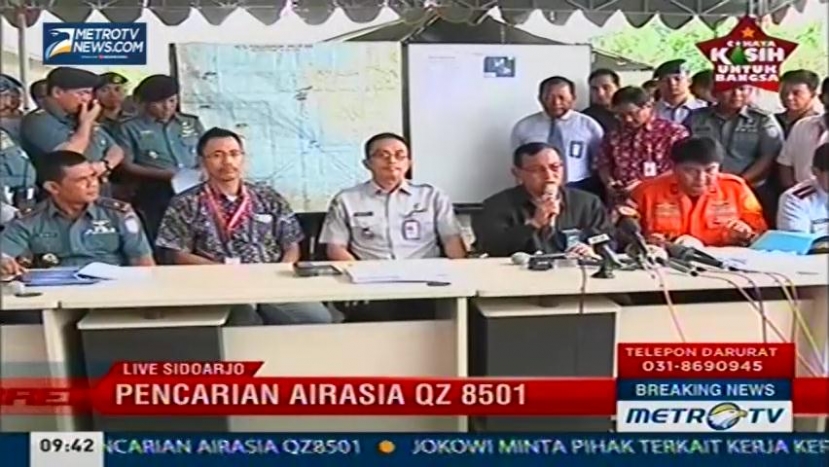 Pencarian pesawat AirAsia QZ8501 dari Surabaya menuju Singapura yang mengalami hilang kontak, terus dilakukan oleh Badan SAR Nasional (Basarnas) dan pihak terkait lainnya, berikut konferensi pers yang digelar di Bandara Internasional Juanda Surabaya, hadir dalam konferensi pers GM Angkasa Pura I Trikora Harjo, Kepala Otoritas Bandara Wilayah III Praminto Hadi, Kepala Basarnas Jawa Timur Hernanto, Komandan Puspenerbal Laksma TNI Sigit Setiyanta, dan Presdir PT Indonesia AirAsia Sunu Widyatmoko, Senin (29/12/2014). Cek Berita dan Artikel yang lain di Google News