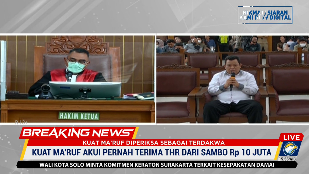 Terdakwa Kasus Pembunuhan terhadap Nofriansyah Yosua Hutabarat alias Brigadir J, Kuat Ma'ruf mengaku tidak menyesal karena tidak mengambil Rp500 juta yang disodorkan terdakwa Ferdy Sambo. Pengakuan tersebut terungkap ketika Ketua Majelis Hakim Wahyu Iman Santoso bertanya soal uang yang disodorkan Sambo usai pembunuhan Yosua.