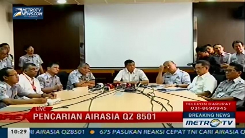 Pencarian pesawat AirAsia QZ8501 dari Surabaya menuju Singapura yang mengalami hilang kontak terus dilakukan oleh Badan SAR Nasional dan pihak terkait lainnya, berikut perkembangan pencarian pesawat AirAsia QZ8501 dalam konferensi pers digelar oleh Menteri Perhubungan di Bandara Soekarno-Hatta. Hadir dalam dialog di Breaking News Kadispen TNI AU Hadi Tjahjanto dan Vice President Federasi Pilot Indonesia Capt M Ali Nahdi, Senin (29/12/2014). Cek Berita dan Artikel yang lain di Google News