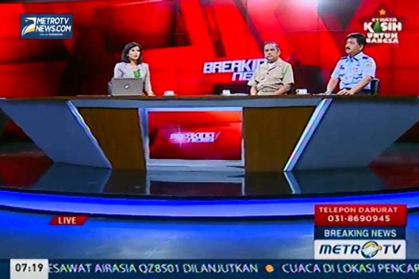 Pencarian pesawat AirAsia QZ8501 dari Surabaya menuju Singapura yang mengalami hilang kontak, terus dilakukan oleh Badan SAR Nasional dan pihak terkait lainnya, berikut perkembangan pencarian pesawat AirAsia QZ8501. Hadir dalam dialog di  Breaking News Mantan Kepala Staf TNI AU Chappy Hakim, Kadispen TNI AU Hadi Tjahjanto, PLT Dirjen Perhubungan Udara Joko Muriatmojo, Senin (29/12/2014).