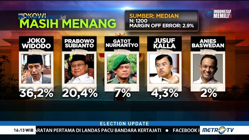 Berdasarkan hasil survei Media Nasional (Median), Elektabilitas Presiden Joko Widodo masih menang dibandingkan kandidat lain sebagai calon presiden. Elektabilitas Jokowi berada di posisi 36,2 persen disusul Prabowo Subianto 20,4 persen.