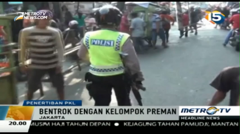 Penertiban lapak pedagang kaki lima di kawasan perbelanjaan Roxy Gambir Jakarta Pusat, diwarnai perlawanan dari orang-orang yang diduga membekingi lapak pedagang. Polisi bersenjata laras panjang bahkan harus melepaskan tembakan ke udara untuk membubarkan masa, Rabu (4/11/2015).