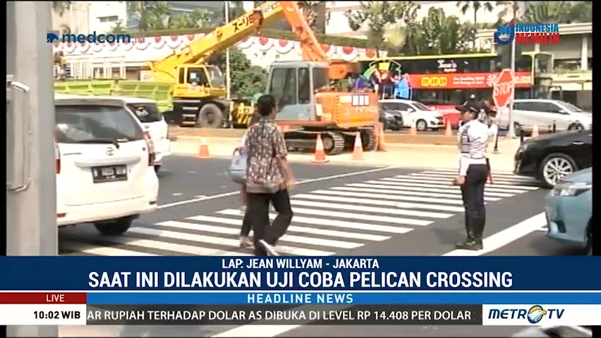 Warga mulai menyeberang di pelican crossing Jalan MH Thamrin, Jakarta Pusat usai jembatan penyeberangan orang (JPO) ditutup. Petugas Dinas Perhubungan DKI Jakarta bersiaga 24 jam membantu penyeberangan warga. Sejumlah warga mengaku kurang nyaman dengan adanya pelican crossing ini dan lebih memilih menggunakan JPO. Cek Berita dan Artikel yang lain di Google News