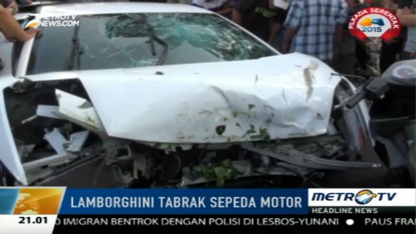 Sebuah mobil mewah lamborghini menabrak sepeda motor di Jalan Boulovard Raya Kelapa Gading, Jakarta Utara, Minggu (6/9/2015). Cek Berita dan Artikel yang lain di Google News