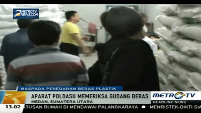 Mengantisipasi peredaran beras yang diduga bercampur dengan beras plastik, Polda Sumatra Utara melakukan pemeriksaan ke beberapa gudang distributor beras di Medan, Sumatra Utara, Minggu (24/5/2015).