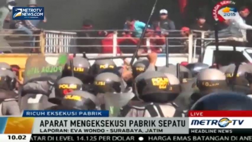 Eksekusi pabrik sepatu PT Cinderella Vila Indonesia berakhir ricuh. Ribuan buruh berusaha menghadang petugas eksekusi dari Pengadilan Negeri Surabaya yang dibantu ratusan personil kepolisian, Kamis (3/9/2015). Cek Berita dan Artikel yang lain di Google News