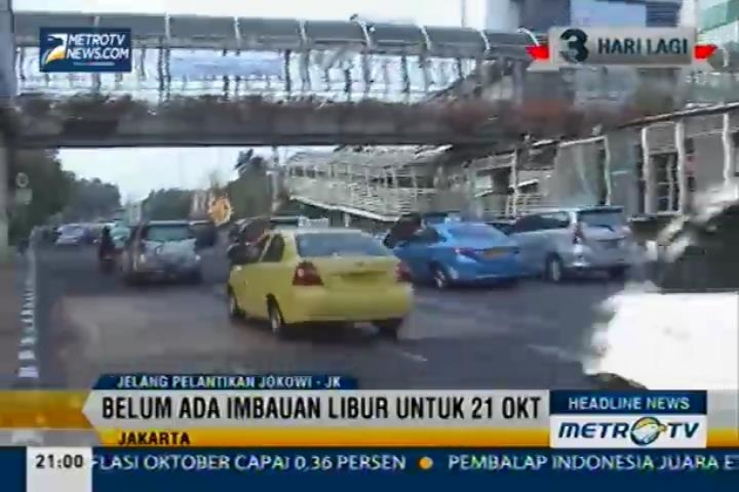 Headline News: Rangkaian kegiatan pelantikan Presiden dan Wakil Presiden terpilih, Joko Widodo dan Jusuf Kalla baik saat di Gedung MPR maupun saat kirab dan pesta rakyat dipastikan akan membuat sejumlah ruas jalan protokol ditutup. Meski demikian sejumlah perkantoran belum mengeluarkan imbauan untuk libur pada 20 Oktober mendatang, Jumat (17/10/2014).