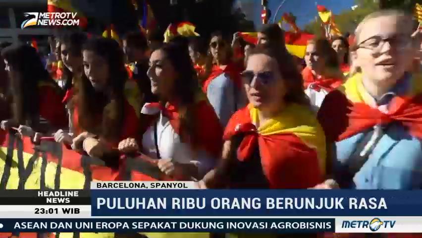 Puluhan ribu orang berunjuk rasa di Barcelona untuk menyuarakan persatuan Spanyol. Massa menginginkan Catalonia tetap menjadi bagian dari Spanyol. Cek Berita dan Artikel yang lain di Google News