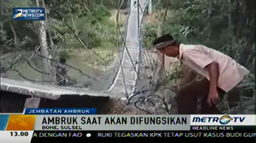 Sebuah jembatan di Kabupaten Bone, Sulawesi Selatan, ambruk karena kelebihan beban. Jembatan gantung yang baru saja selesai diresmikan itu baru saja akan difungsikan, namun mengalami keruntuhan ketika puluhan warga sedang melakukan ritual syukuran, Sabtu (21/2/2015). Cek Berita dan Artikel yang lain di Google News