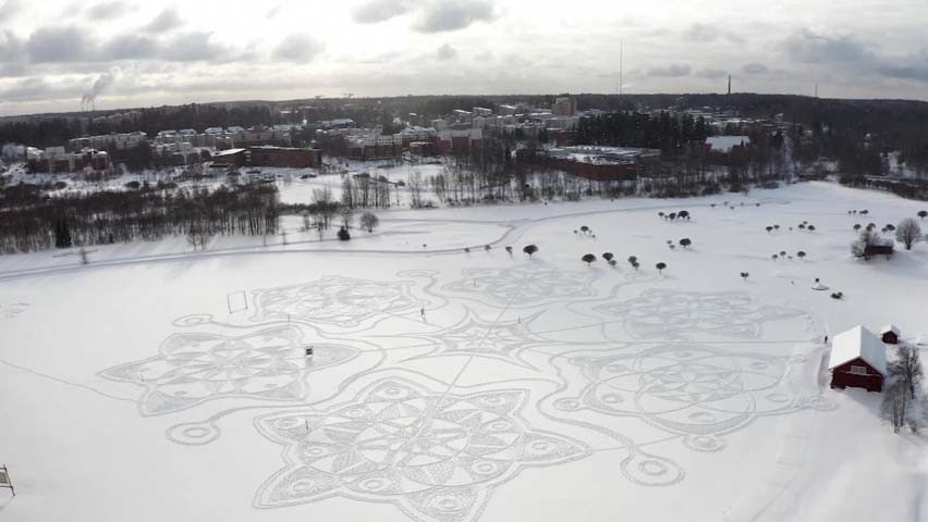 Lukisan raksasa yang dibuat dari ribuan jejak kaki diatas salju membuat warga Finnish Helsinki, Finlandia takjub akan keindahannya. Pola geometri rumit berbentuk kepingan salju nampak di atas lapangan salju di Finnish, Helksinki.