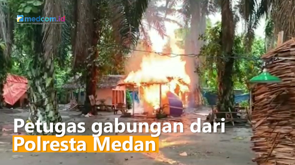 Petugas gabungan dari Polrestabes Medan membongkar dan membakar lapak judi di Kecamatan Kutalimbaru, Kabupaten Deli Serdang, Sumatera Utara pada Rabu (24/8/2022) sore. Satu persatu lapak judi yang kerap dijadikan sebagai tempat berjudi dan konsumsi narkoba ini dibongkar dan dibakar oleh petugas.