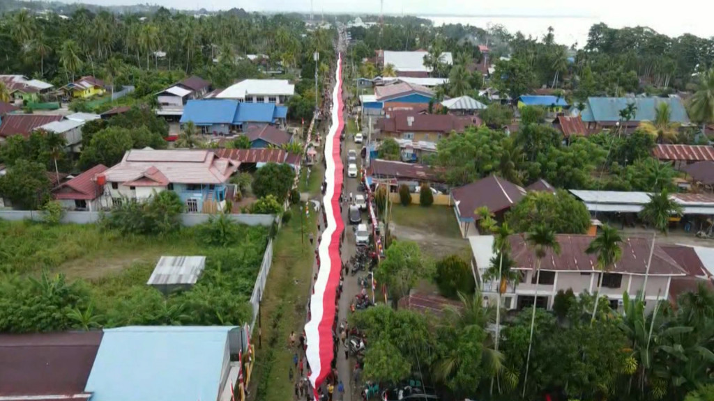 Dalam rangka menyambut HUT 77 RI, ribuan pemuda dan pelajar di Nabire membentangkan dan mengarak bendera merah putih sepanjang seribu meter di sepanjang jalan Yan Mamoribo, Siriwini Nabire, Papua.