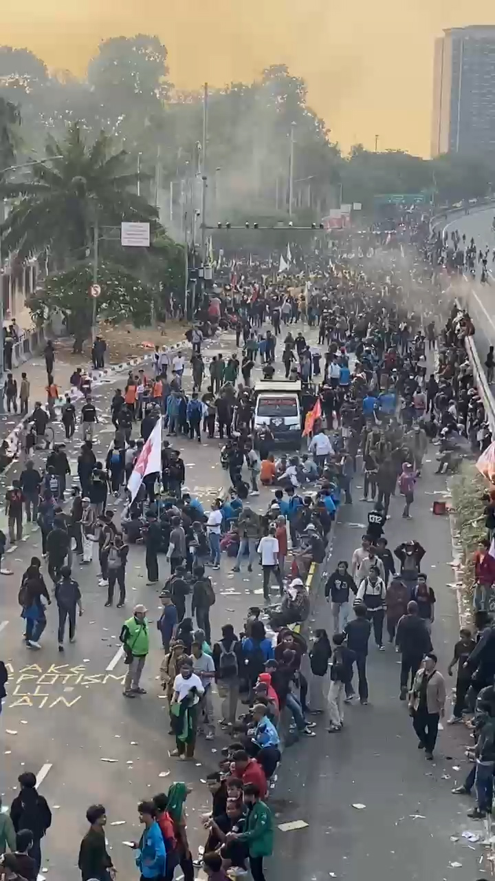 Suasana senja di depan Gedung DPR-RI dipenuhi dengan ribuan demonstran yang berkumpul untuk menyuarakan tuntutan mereka kepada pemerintah Massa yang terdiri dari berbagai elemen masyarakat mulai memadati area sejak siang hari, membawa spanduk dan poster yang berisi berbagai aspirasi.