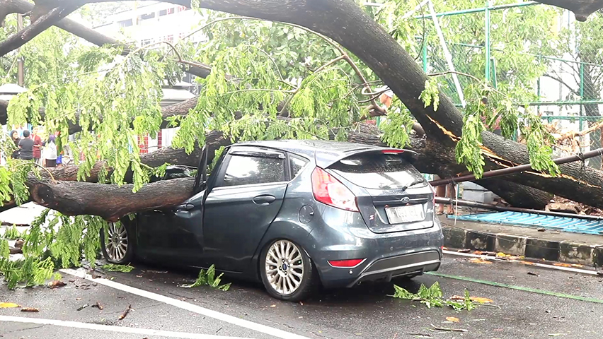 Hujan deras disertai angin kencang menyebabkan pohon jenis angsana di depan GOR Kota Tangerang tumbang hingga menimpa tiga mobil. Petugas dari BPBD Kota Tangerang dan gabungan terpaksa menutup akses jalan yang membuat arus lalu lintas terhenti karena proses evakuasi batang pohon. Petugas dari BPBD Kota Tangerang dibantu warga memotong batang pohon yang tersangkut dengan gergaji mesin.