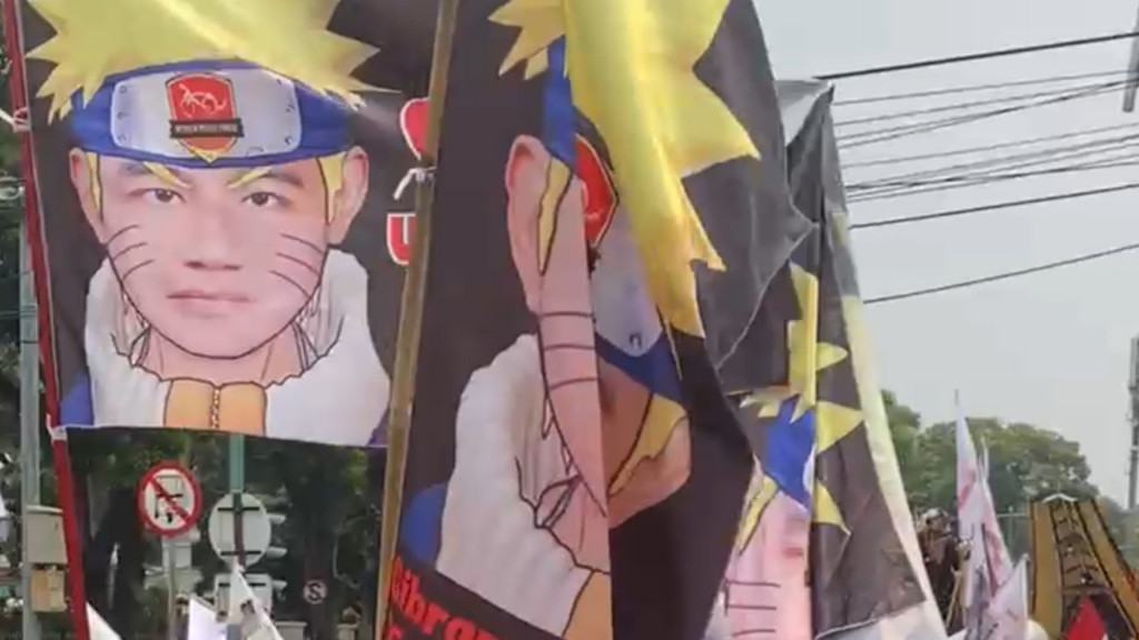 Kocak! Massa Pendukung Bawa Bendera Naruto Berwajah Gibran