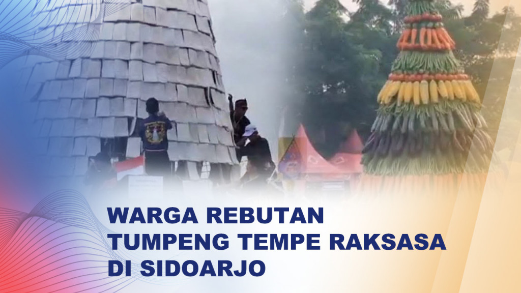 Sidoarjo: Warga Desa Sedenganmijen, Kecamatan Krian, menggelar tradisi rebutan tumpeng tempe raksasa dalam rangka menyambut bulan suci Ramadan. Tumpeng tempe setinggi sekitar 10 meter tersebut menjadi pusat perhatian masyarakat yang antusias mengikuti rangkaian acara.