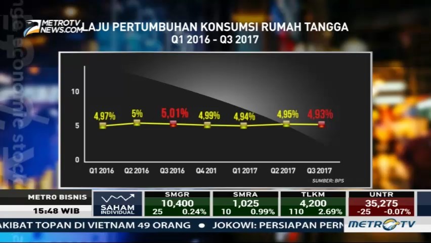 Hasil survei yang dilakukan oleh BPS menunjukan tingkat konsumsi rumah tangga di Kuartal III lalu hanya mencapai 4,93 persen di bawah persentase pertumbuhan ekonomi triwulan ketiga yang menjadi 5,06%.