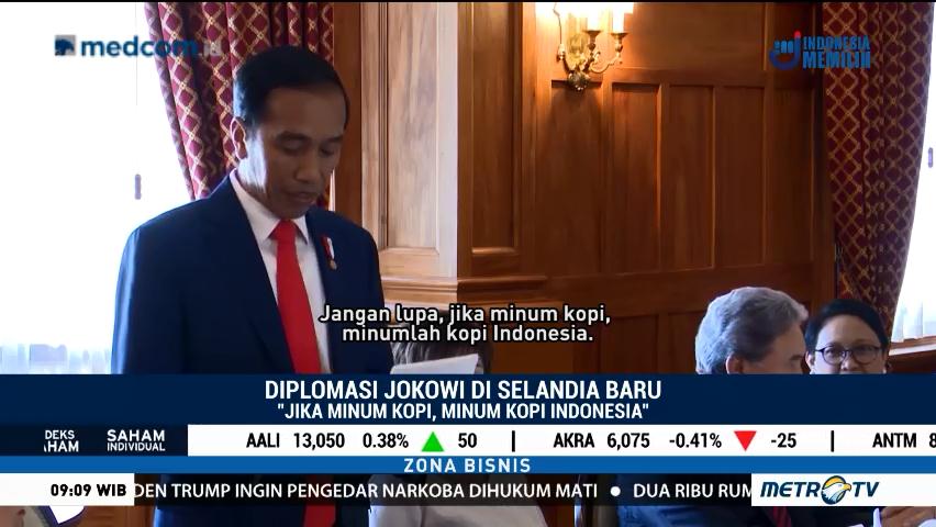 Dalam lawatan ke Selandia Baru, Presiden Joko Widodo juga memanfaatkan suasana santai dan akrab di jamuan makan siang kenegaraan dengan Gubernur Jenderal Selandia Baru Dame Patsy Reddy untuk mempromosikan kopi Indonesia. Menurut Presiden Jokowi, kopi Indonesia memiliki cita rasa yang unik dan pasti disukai warga Selandia Baru yang juga sedang minum kopi. Ia pun mengingatkan jika ingin minum kopi, minumlah kopi dari Indonesia. Cek Berita dan Artikel yang lain di Google News