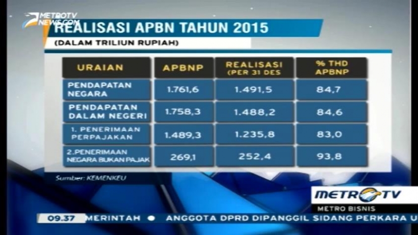 Hingga Rabu (27/1) pemerintah mencatat defisit anggaran APBNP turun dari 2,8% menjadi 2,56% disebabkan penerimaan perpajakan, Kamis (28/1/2016).