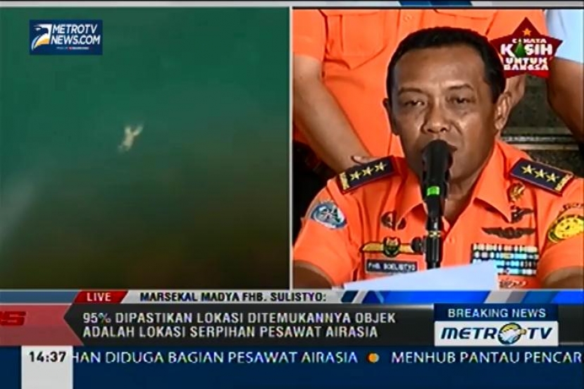 Metrotvnews.com: Marsekal Madya FHB Sulistyo memastikan serpihan-serpihan yang ditemukan di laut adalah bagian dari pesawat AirAsia QZ8501. Salah satu benda di antaranya dalah emergency exit door, Selasa (30/12/2014). Cek Berita dan Artikel yang lain di Google News