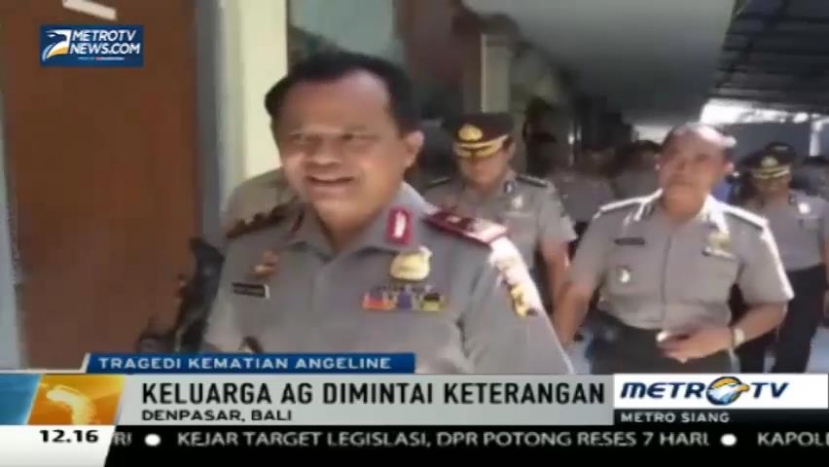 Jajaran Kepolisian Daerah Bali terus mengembangkan penyidikan kasus kematian Angeline. Kapolda Bali, Irjen Pol Ronny F Sompie mengatakan keluarga AG dihadirkan dari NTT untuk dimintai keterangan terkait latar belakang keluarga, Selasa (23/6/2015). Cek Berita dan Artikel yang lain di Google News