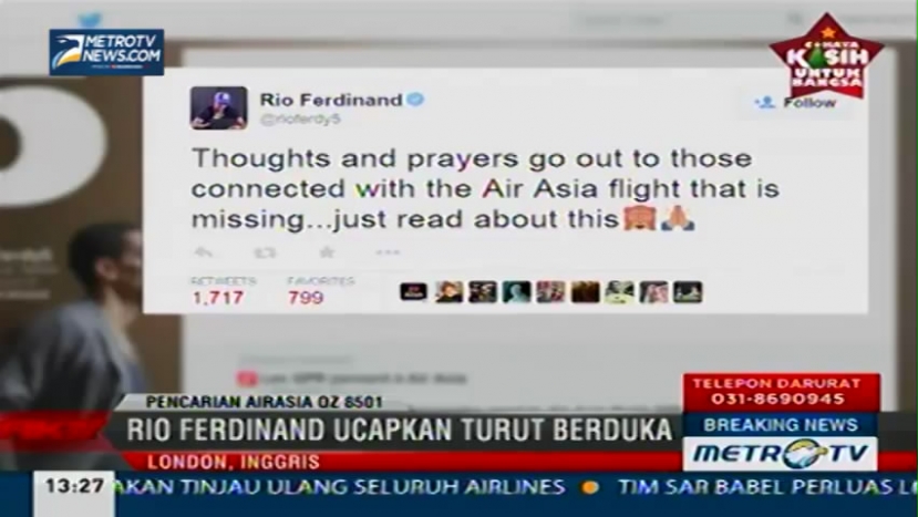 Keprihatinan atas hilangnya pesawat AirAsia QZ8501 juga dirasakan klub Liga Primer Inggris, Queens Park Rangers yang memang disponsori maskapai asal Malaysia tersebut. Selain itu sejumlah pemain QPR seperti Charlie Austin dan Rio Fedinand ucapkan rasa simpati di akun twitter masing-masing, Senin (29/12/2014).