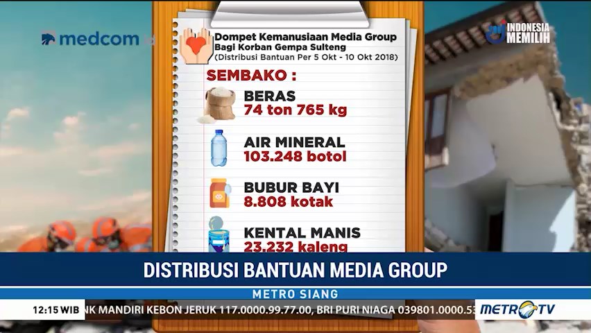 Yayasan Media Group terus menyalurkan bantuan kepada para korban gempa dan tsunami di Palu, Donggala, dan Sigi, Sulawesi Tengah. Hingga kini total ada 58 desa yang telah terdistribusikan bantuan. Seluruh bantuan ini berasal dari masyarakat Indonesia yang dikumpulkan oleh Media Group.