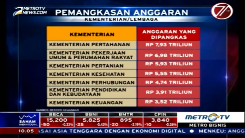 Pemangkasan anggaran belanja Pemerintah menjadi lebih besar dari yang sudah direncanakan. Pemangkasan terbesar ada pada Kementerian Pertahanan sebesar Rp7,93 triliun, Jumat (26/8/2016). Cek Berita dan Artikel yang lain di Google News