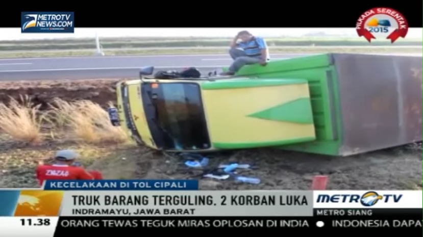 Sebuah truk box pengangkut garmen terguling di jalan tol Cikopo-Palimanan KM 138 Cikedung Kabupaten Indramayu, Jawa Barat, Jumat (19/6/2015). Cek Berita dan Artikel yang lain di Google News