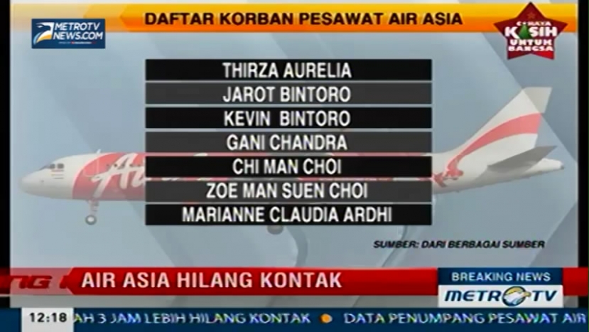 Berikut ini adalah daftar nama korban Pesawat AirAsia dengan nomor penerbangan QZ8501 dengan rute penerbangan dari Surabaya menuju Singapura, Minggu (28/12/2014).