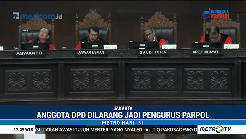 Mahkamah Konstitusi mengabulkan permohonan pengujian Pasal 128 huruf l Undang-undang Nomor 7 Tahun 2017 tentang Pemilihan Umum. Putusan ini sekaligus menegaskan bahwa pengurus partai politik dilarang untuk menjadi anggota Dewan Perwakilan Daerah (DPD) Cek Berita dan Artikel yang lain di Google News