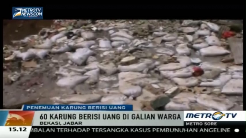 Sebanyak 60 karung berisi uang kertas rupiah berbagai macam pecahan ditemukan warga di sebuah kubangan galian di Bekasi, Jawa Barat. Polisi telah memastikan uang tersebut merupakan uang asli, Minggu (14/6/2015). Cek Berita dan Artikel yang lain di Google News
