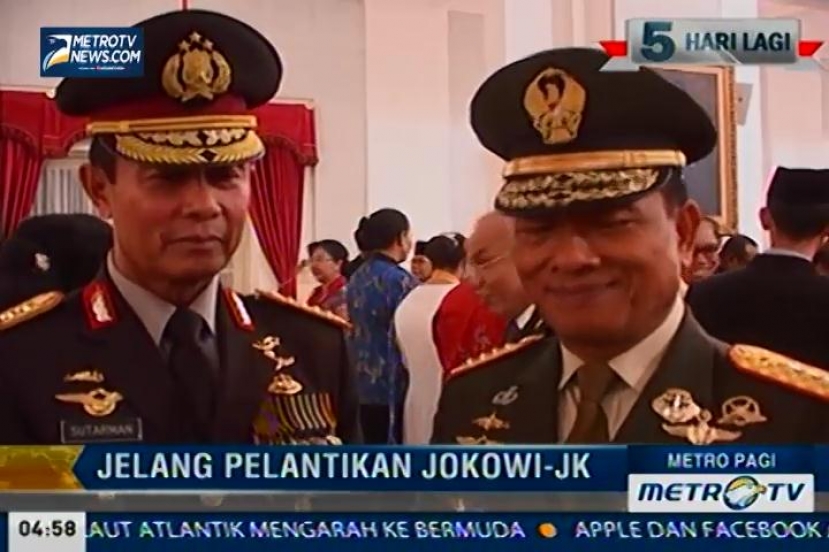 Metro Pagi: Pengamanan pelantikan Jokowi-JK sudah diserahkan kepada Kapolri, untuk mengamankan pelantikan presiden dan wakil presiden, TNI Polri mengerahkan lebih dari 22 ribu personelnya mulai Ring 1 hingga Ring 4, Rabu (15/10/2014).