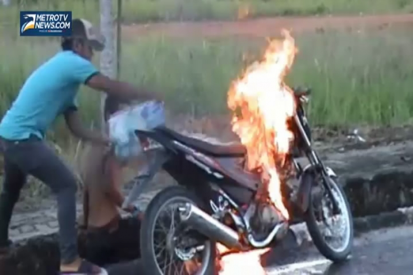 Metrotvnews.com, Merangin: Riko panik dan segera memadamkan api yang mulai melahap sepeda motornya. Warga yang berada di sekitar pun ikut membantu riko menyiramkan air dari selokan di pinggir Jalan Rahmad Syukur, Kelurahan Pematan Kandis, Kecamatan Tabir Barat, Merangin, Rabu (26/11/2014). Diduga api berasal dari korsleting listrik menyambar bensin yang membanjiri karburator sepeda motor. Tidak ada korban jiwa dalam musibah tersebut namun Riko, warga Desa Ngaol, mengalami kerugian puluhan juta rupiah. Lihat juga video di http://youtu.be/SOe0IUPF4GU