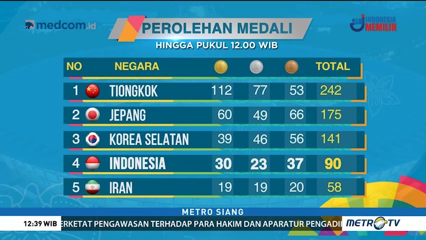 Hingga hari ke dua belas gelaran Asian Games 2018 Indonesia telah mengemas 30 medali emas. Raihan tersebut memastikan merah putih berada di posisi lima besar.