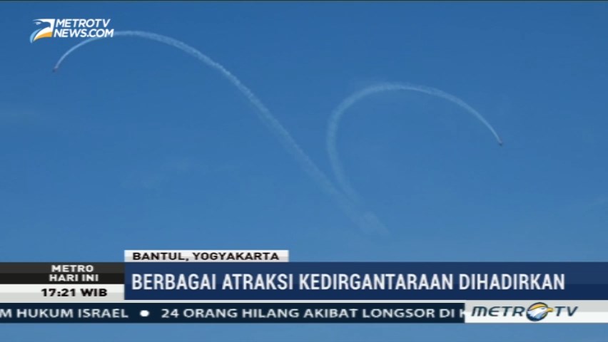 Berbagai atraksi olahraga kedirgantaraan mewarnai hari terakhir rangkaian acara Jogja International Air Show 2017 yang berlangsung di landasan pacu Pantai Depok, Bantul, Yogyakarta. Atraksi yang ditampilkan berupa parade pesawat Jupiter Aerobatic, Paralayang, dan terjun payung. Cek Berita dan Artikel yang lain di Google News