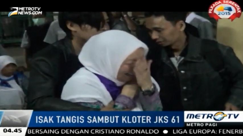Metrotvnews.com: Isak tangis mewarnai kedatangan ratusan jemaah haji Embarkasi Jakarta-Bekasi Kloter 61 Kota Bekasi pada Kamis (22/10/2015) malam, Kloter ini merupakan kloter dengan jumlah korban tewas terbanyak pada tragedi Mina. Cek Berita dan Artikel yang lain di Google News