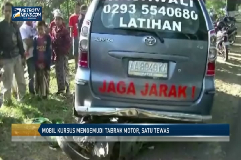 Metrotvnews.com, Temanggung: Seorang pengendara motor tewas ditabrak mobil yang digunakan untuk latihan mengemudi di Temanggung, Jawa Tengah, Kamis (21/8/2014). Kecelakaan bermula ketika motor yang dikendarai Slamet Bawono oleng setelah bersenggolan dengan pengendara lain. Dari arah berlawanan muncul mobil dan seketika menabrak motor dan melindas Slamet Bawono. Korban pun tewas dalam perjalanan menuju rumah sakit karena luka parah di bagian kepala. Lihat juga video di http://youtu.be/38sI52PLu1w