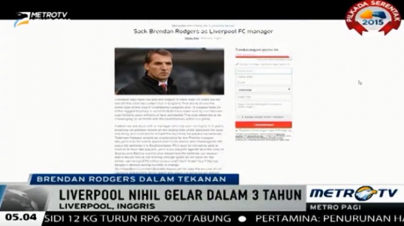 Metrotvnews.com: Hasil buruk yang diraih Liverpool serta performa yang tidak konsisten di bawah pelatih Brendan Rodgers membuat posisi Rodgers kian tertekan. Suporter Liverpool pun bereaksi dengan membuat petisi online agar Rodgers segea angkat koper dari Anfield. Cek Berita dan Artikel yang lain di Google News