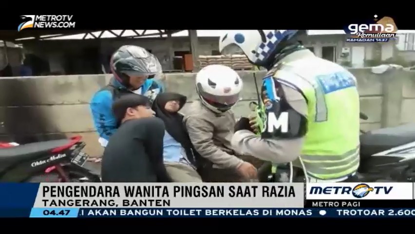 Seorang wanita pengendara motor pingsan saat dipergoki polisi bersembunyi di gang buntu untuk menghindari Operasi Patuh Kalimaya yang digelar di Jalan Raya Cikupa, Tangerang, Banten, Minggu (29/5/2016). Cek Berita dan Artikel yang lain di Google News