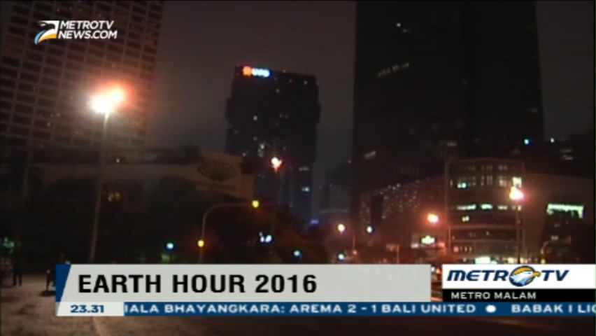 Suasana kampanye Earth Hour yang turut di gelar di Bundaran HI, Jakarta Pusat, Sabtu (19/3/2016). Patung Selamat Datang dan sejumlah gedung juga ikut mematikan lampu dalam kampanye lingkungan hidup ini.