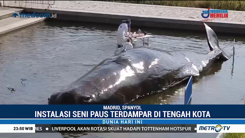 Penduduk yang menyeberangi Jembatan Segovia, Madrid dikejutkan dengan pemandangan paus sperma yang terdampar di tengah sungai. Namun paus itu bukanlah asli, melainkan bagian dari instalasi atau seni buatan seniman Belgia. Cek Berita dan Artikel yang lain di Google News