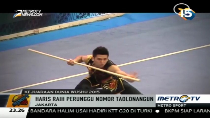 Atlet Wushu Indonesia Harris Horatius berhasil meraih medali perunggu di nomor taolonangun. Dengan raihan ini, Indonesia mmenempati posisi ketiga dengan raihan tiga medali emas dan Tiga medali perunggu di Kejuaraan Dunia Whusu 2015, Senin (16/11/2015). Cek Berita dan Artikel yang lain di Google News