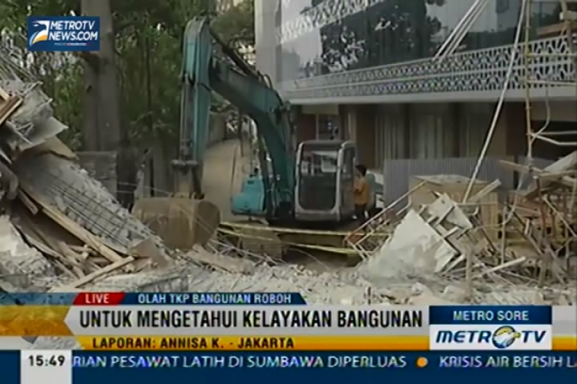 Metro Sore: Tim Puslabfor Mabes Polri melakukan olah tempat terjadinya perkara jembatan ambruk di Taman Ismail Marzuki Jakarta, Senin (3/11/2014). Olah TKP dilakukan untuk mencari penyebab ambruknya jembatan penghubung Gedung Arsip dengan Gedung Perpustakaan Daerah DKI Jakarta.