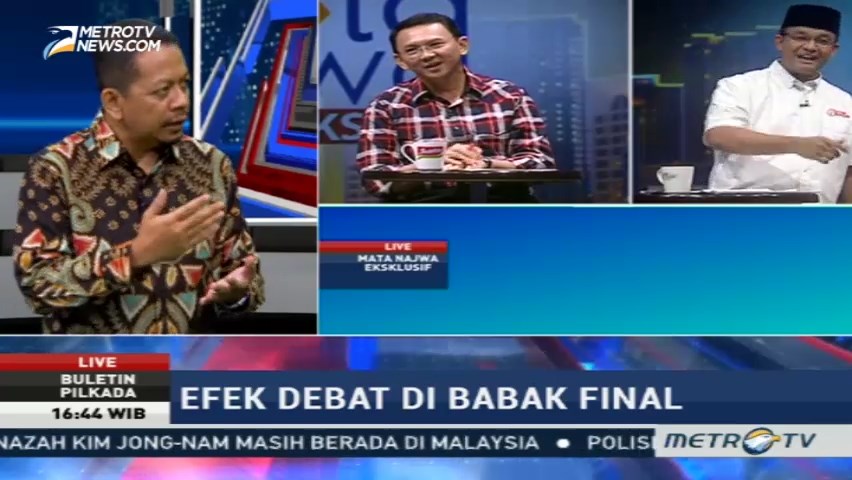 Dua kandidat calon gubernur DKI Jakarta hadir dalam satu panggung untuk memaparkan program kerja masing-masing dalam debat babak final Pilkada DKI Jakarta yang dipandu Najwa Shihab. Direktur Eks Indobarometer Muhammad Qodari menilai debat yang dipandu oleh Najwa Shihab ini menyajikan pertanyaan yang lebih personal, selain itu Najwa Shihab sebagai moderator dinilai dapat menggali lebih jauh tentang masing-masing calon. Cek Berita dan Artikel yang lain di Google News
