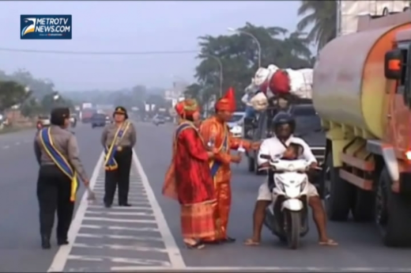 Metrotvnews.com, Dharmasraya: Untuk menarik simpati pengguna jalan, sejumlah anggota Satlantas Polres Dharmasraya, Sumatra Barat, bertugas dengan menggunakan pakaian adat Minangkabau, pada hari Minggu (31/08/2014). Para polisi juga membagikan bunga kepada para pengguna jalan sebagai bentuk aksi simpati kepada warga masyarakat. Selain untuk lebih dekat dan memperbaiki citra kepolisian kepada masyarakat, aksi ini dilakukan untuk memperingati HUT Polwan ke-66. Lihat video disini: http://youtu.be/9k05Z8-21Kk