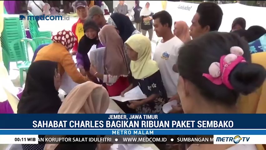 Komunitas Sahabat Charles Meikyansyah membagikan paket sembako kepada warga Jember, Jawa Timur. Ribuan warga pun antre dengan tertib untuk mendapatkan sembako. Kegiatan ini digelar dengan tujuan untuk berbagi kebahagiaan dalam menyambut Hari Raya Idulfitri.