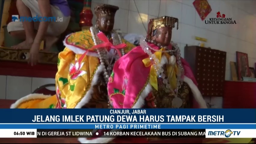 Menjelang perayaan tahun baru Imlek, patung dewa-dewi di klenteng Vihara Bumi Pharsjia, Cianjur, Jawa Barat, dibersihkan serta diganti jubah. Pemandian patung merupakan tradisi dan bagi warga yang ikut memandikan patung merupakan sebuah berkah. Cek Berita dan Artikel yang lain di Google News