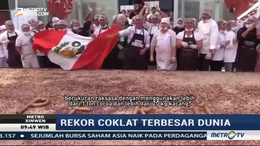 Sekelompok pastry chef di Peru berhasil mencetak rekor dunia versi Guinness setelah membuat bar cokelat raksasa dengan menggunakan lebih dari 1 ton cocoa dan lebih dari 20 kg kacang. Coklat raksasa ini menghabiskan biaya lebih dari USD 77 ribu. Cek Berita dan Artikel yang lain di Google News