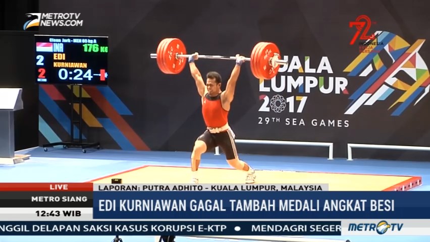 Lifter Indonesia Edi Kurniawan gagal meraih medali di hari terakhir pertandingan cabang olahraga angkat besi SEA Games 2017. Edi Kurniawan bersaing ketat dengan lifter Malaysia dan harus puas berada di posisi ke-4. Cek Berita dan Artikel yang lain di Google News